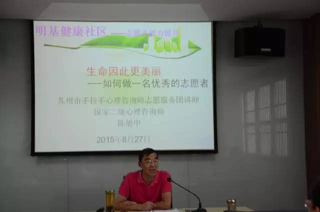 8月27日下午,明基健康社区金色家园社区的志愿者培训在金色家园社区服务中心如期举行。本次志愿者培训以“生命因此更美丽——如何做一名优秀的志愿者“为主题,主要目的是为了让社区中的居民骨干提升志愿者的能力。本次培训由苏州市手拉手心理咨询师志愿服务团讲师陈旭中老师主持。