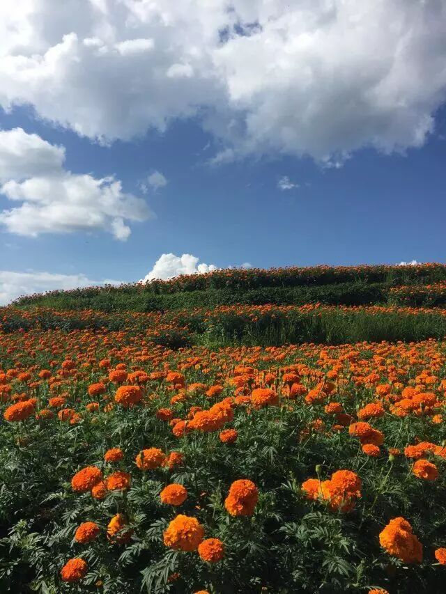 虽然山路崎岖难行,但是沿途也有美丽的风景,今天晴空万里, 山上还有大片的万寿菊,在蓝天下格外明艳。